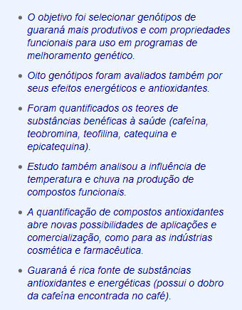 As informações vão incorporar programas de melhoramento genético e ampliar o potencial de uso do guaraná em indústrias como a cosmética e a farmacêutica. Também foram propostos cruzamentos para uso no programa de melhoramento genético do guaraná e observada a influência de fatores como temperatura e chuva nas características químicas dos genótipos. “É interessante que a cultura do guaraná seja implantada em locais com temperaturas mais altas para obter maiores teores de cafeína e em locais com maiores precipitações médias anuais para alcançar teores mais altos de catequinas”, informa a agrônoma Natasha Nina, autora da pesquisa.