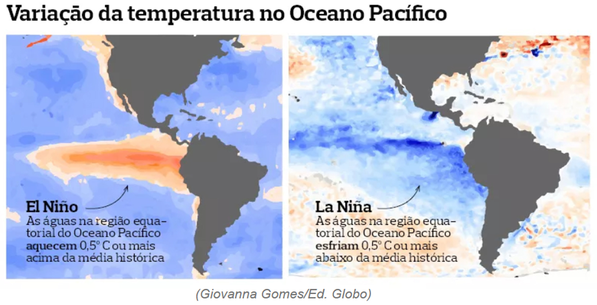 El Niño. O fenômeno consiste em um aquecimento acima do normal. Esse aquecimento faz com que a água do oceano evapore mais facilmente, gerando mais energia para a atmosfera. A consequência dessa energia, que é carregada pelos ventos, é uma alteração na regularidade de chuvas e temperaturas.
